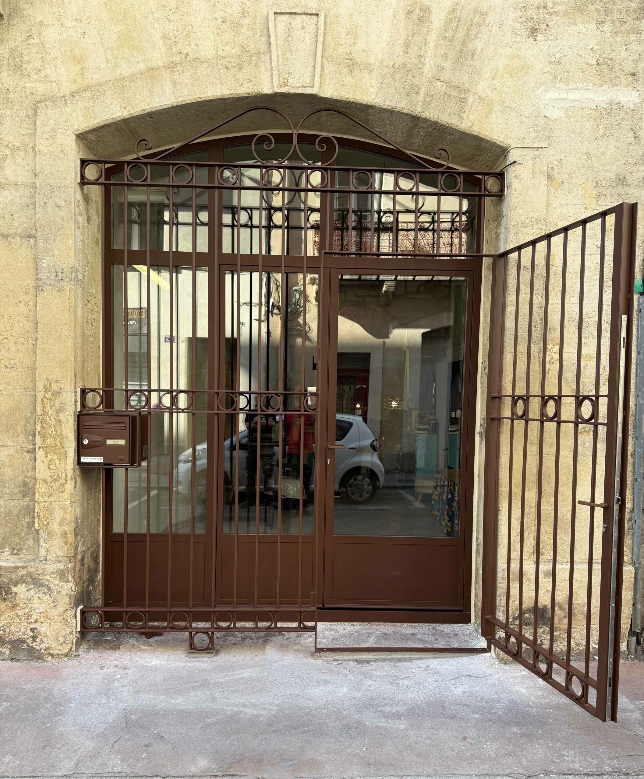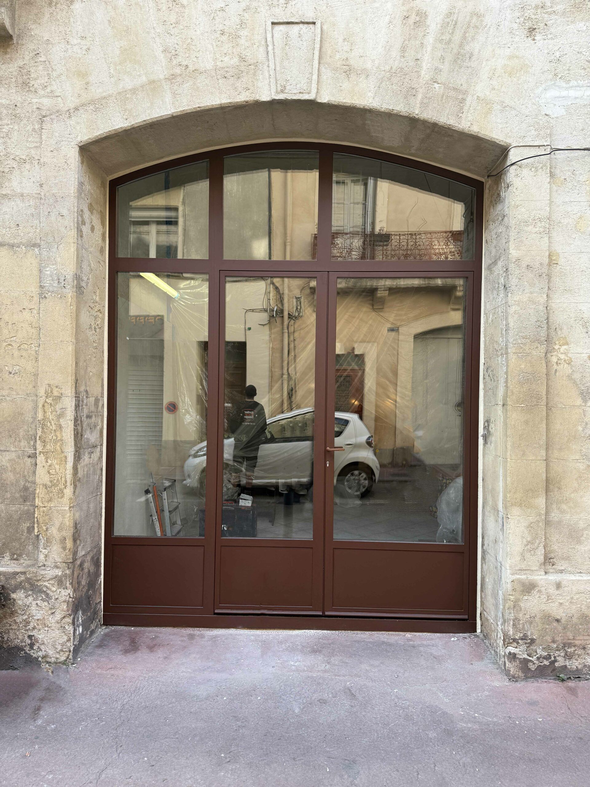 Réalisation d’une vitrine en acier thermolaqué cintré, conçue pour s’intégrer à une façade en pierre.